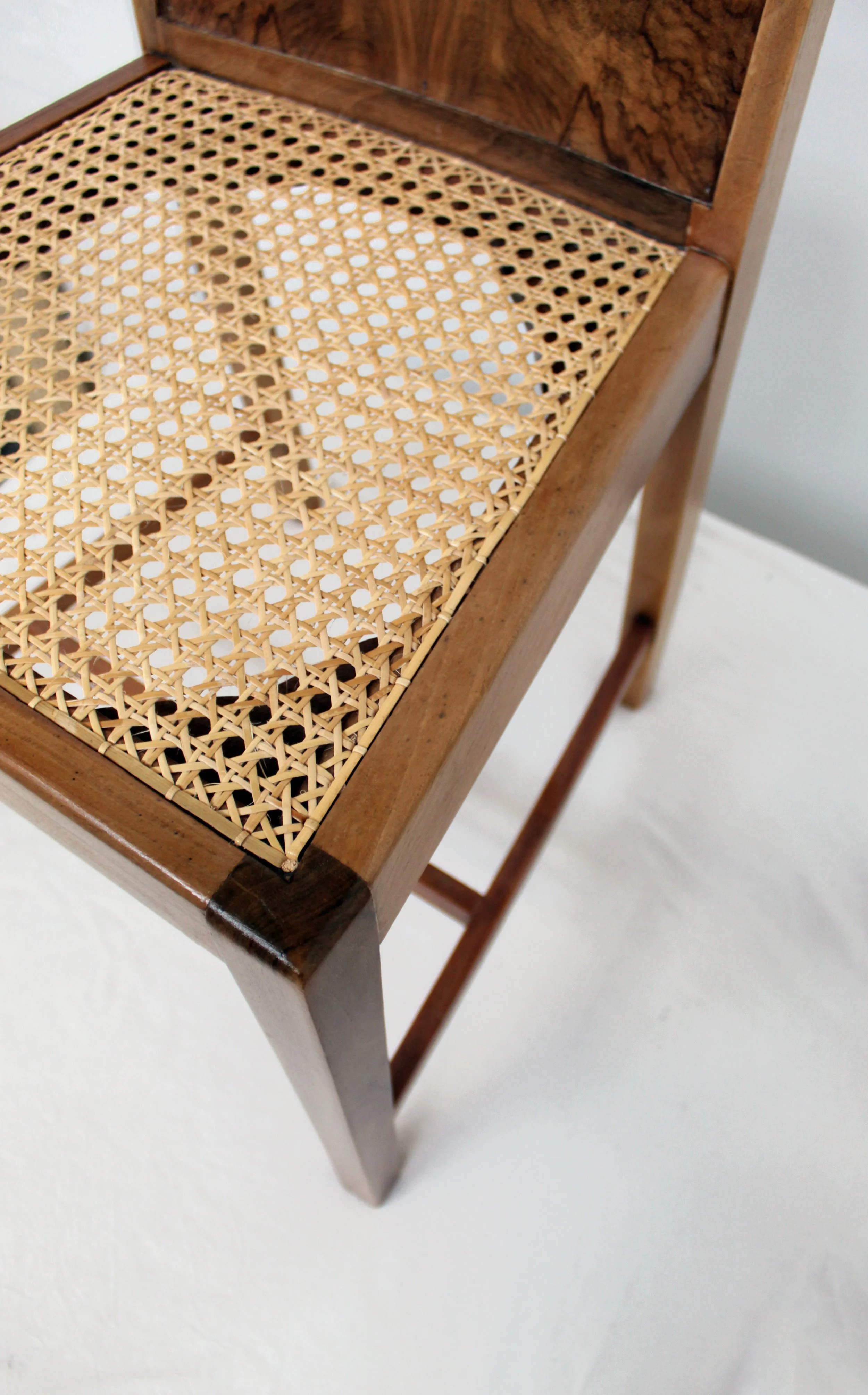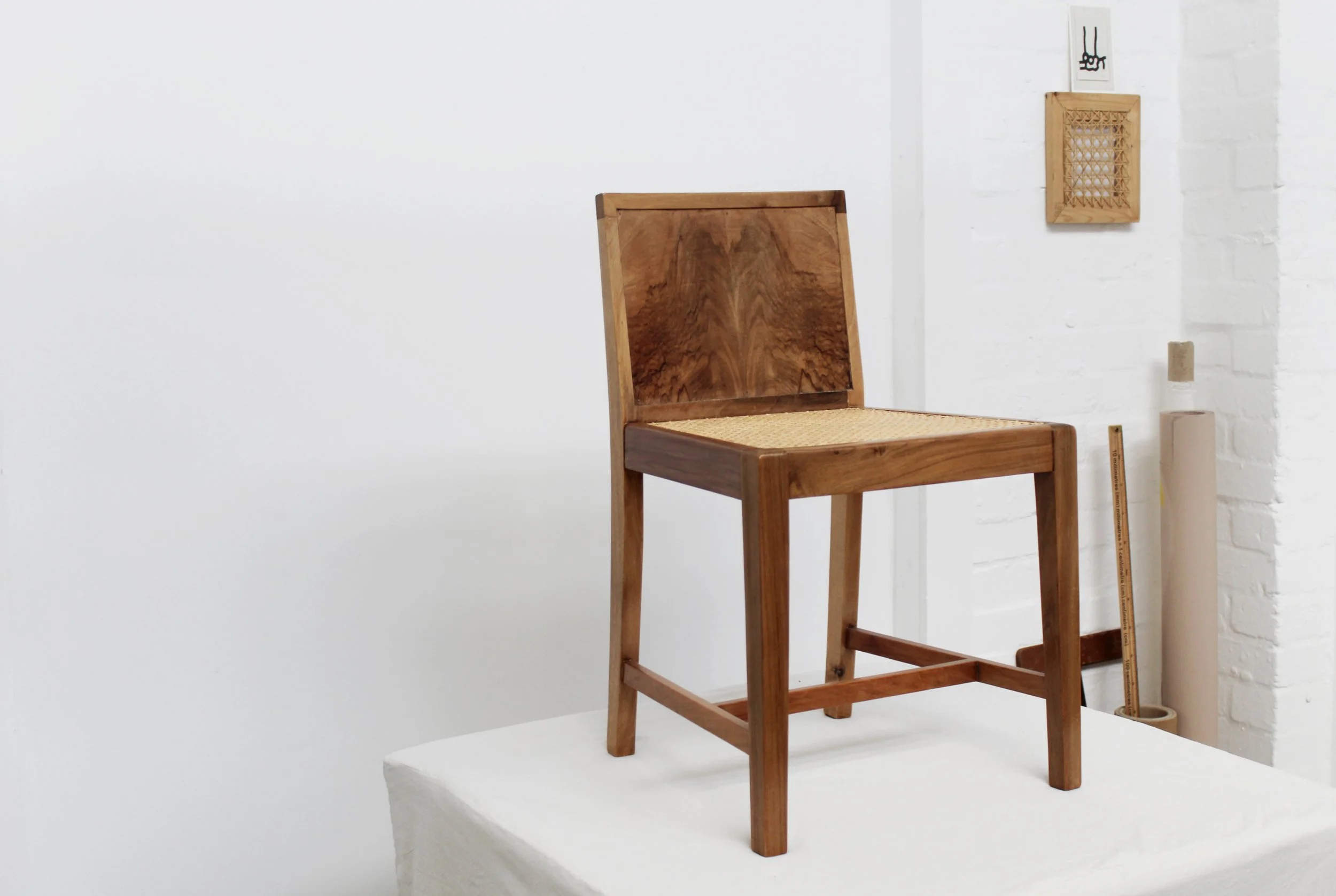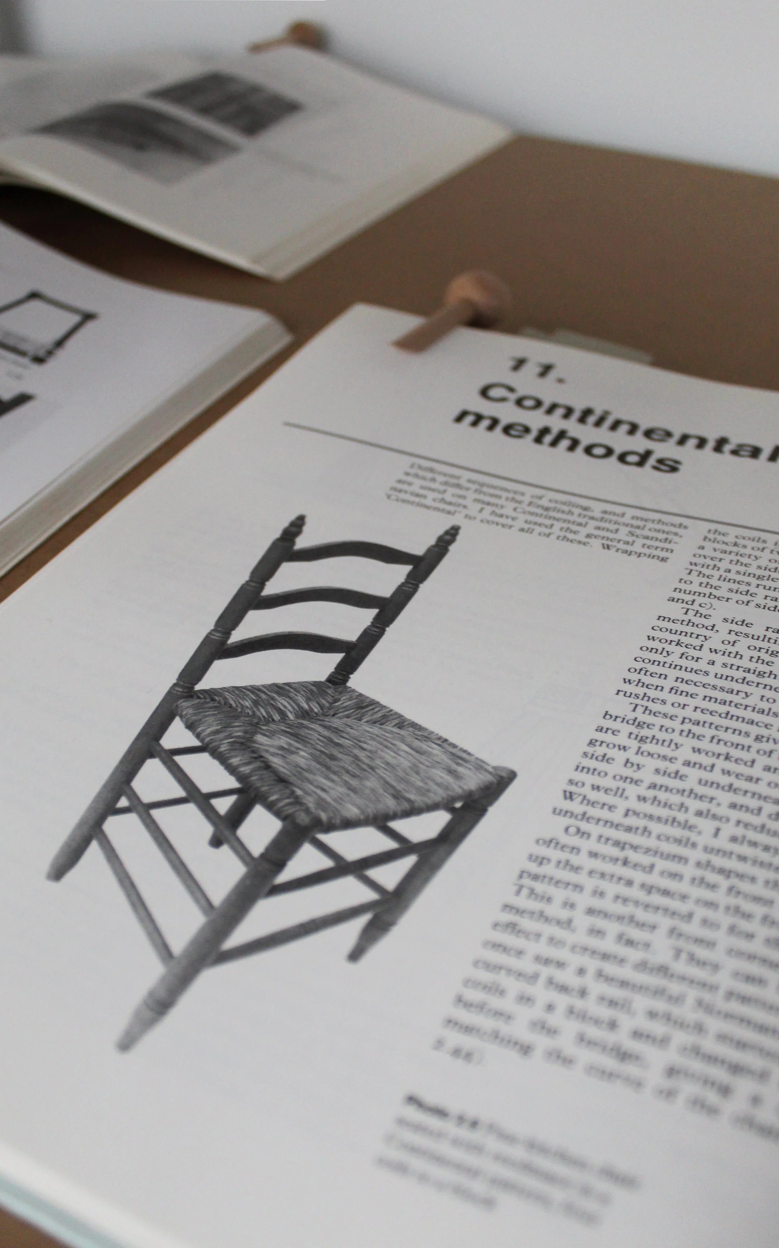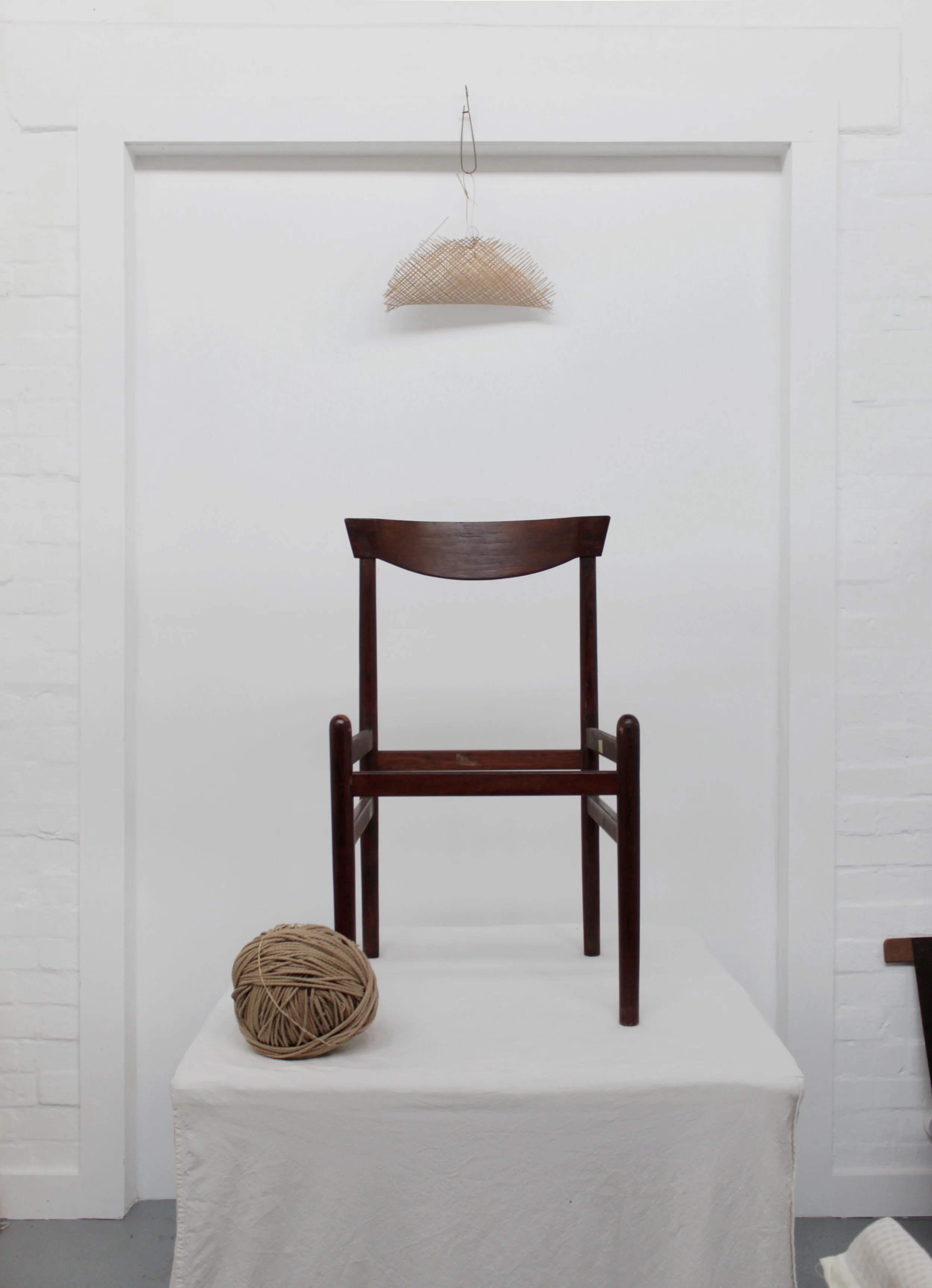 back view of a wooden chair frame on a white table with a cord ball next to it