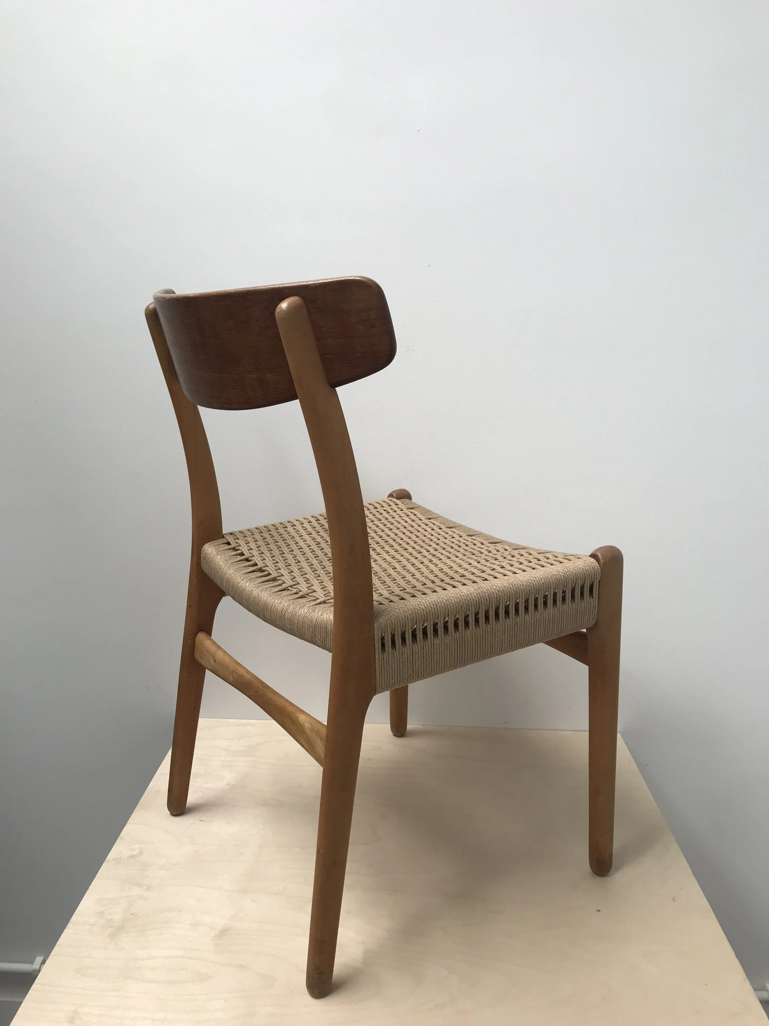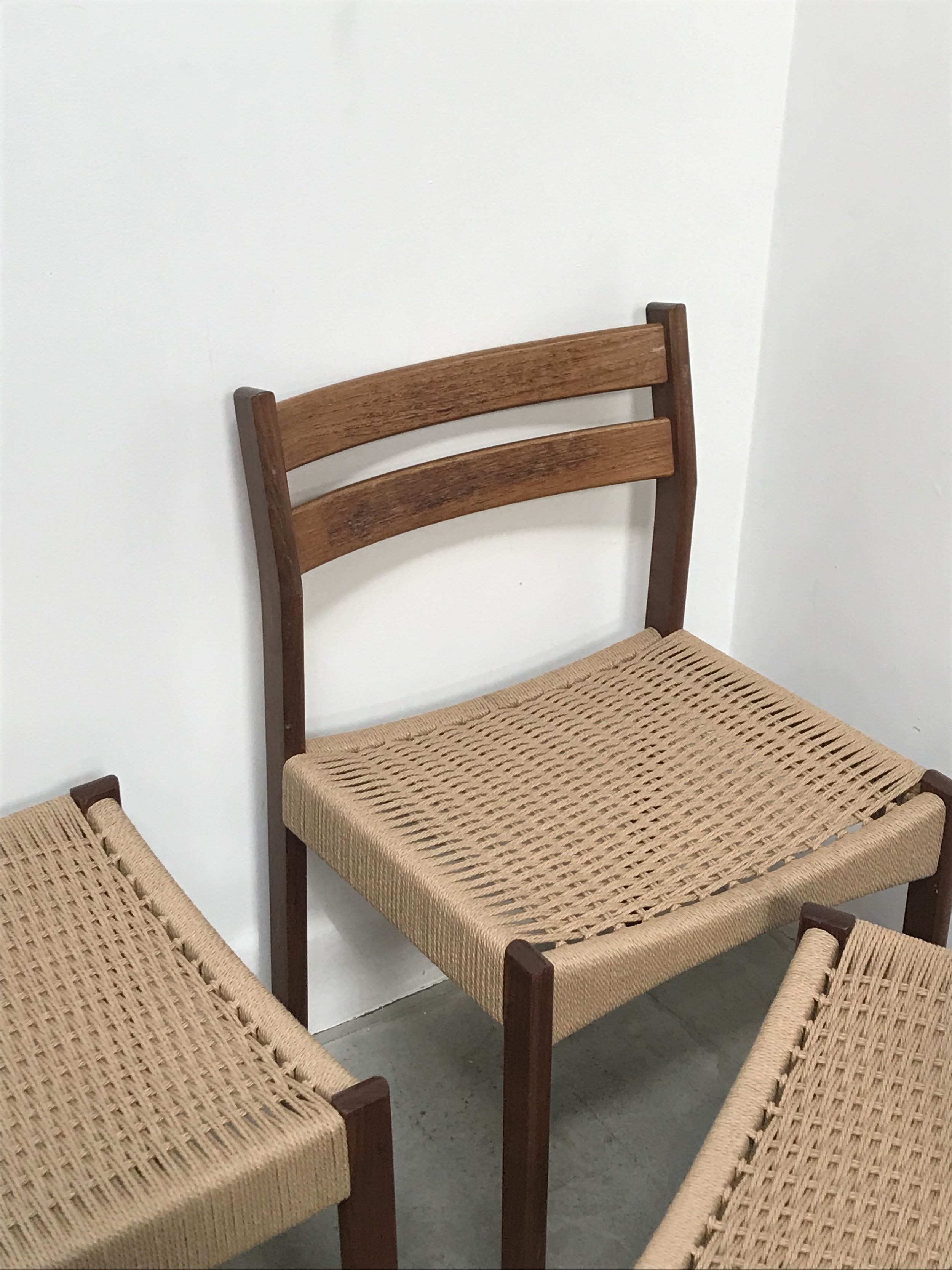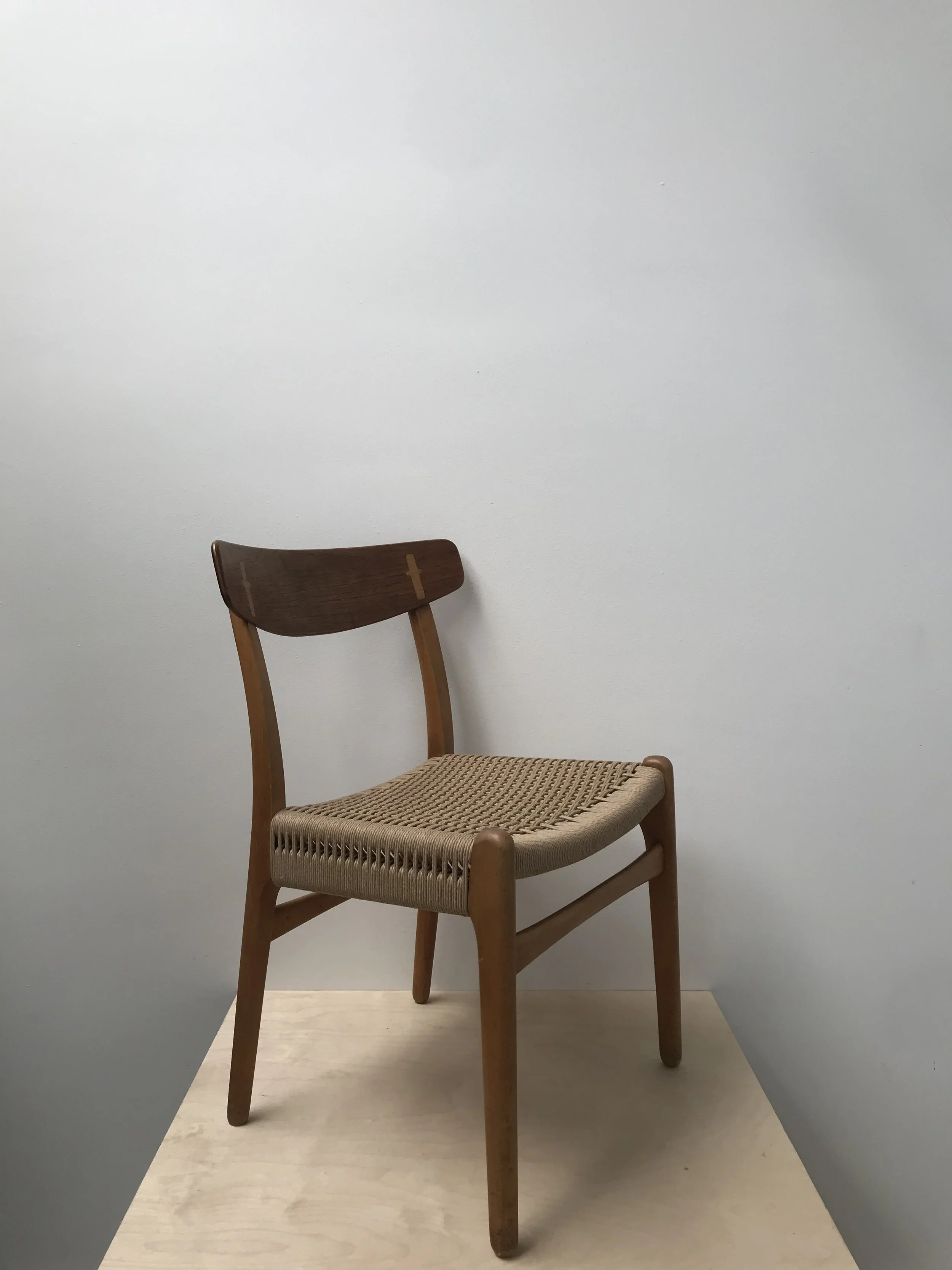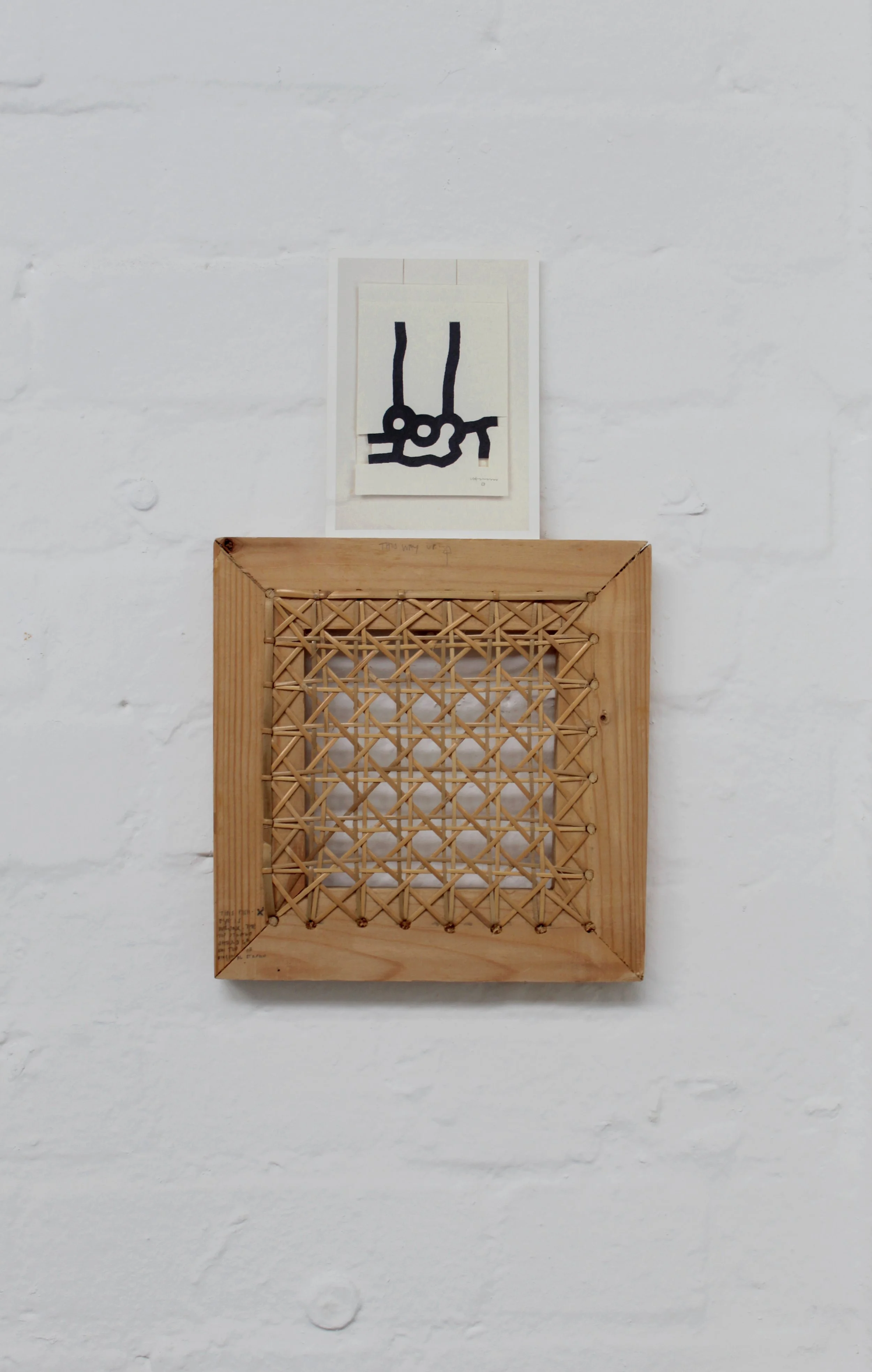 back view of a wooden chair frame on a white table with a cord ball next to it